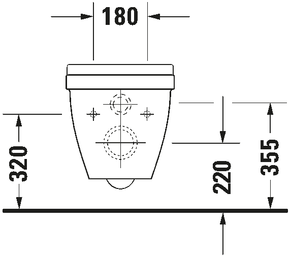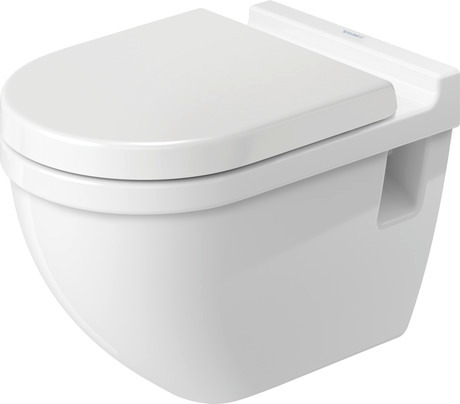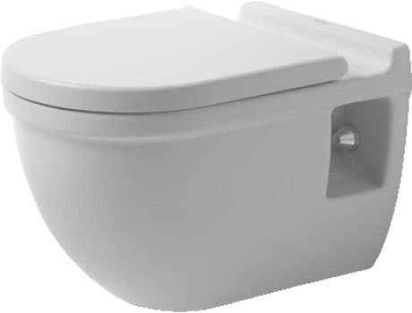 DURAVIT Starck 3 závěsný klozet Design Philippe Starck, splachovací nádržka se zvýšenou sedací polohou plus 50 mm z keramické sanitární keramiky, závěsný klozet na 6 litrů splachovací vody, třída EWL 2. Obdélníkový tvar mísy splývající v přední části do půlkruhu. Připojení na stěnu s podstavcem. Z hygienických důvodů s uzavřeným splachovacím okrajem a keramickým rozdělovačem splachovací vody. Zvýšená poloha sedátka včetně WC sedátka 480 mm s běžnými instalačními rozměry 220 mm středového výtoku. Světlá výška od podlahy 60/40 mm. Abmessungen(BxTxH)360x545x355/390mm. Bílá barva. Obj. č. 2215090000.