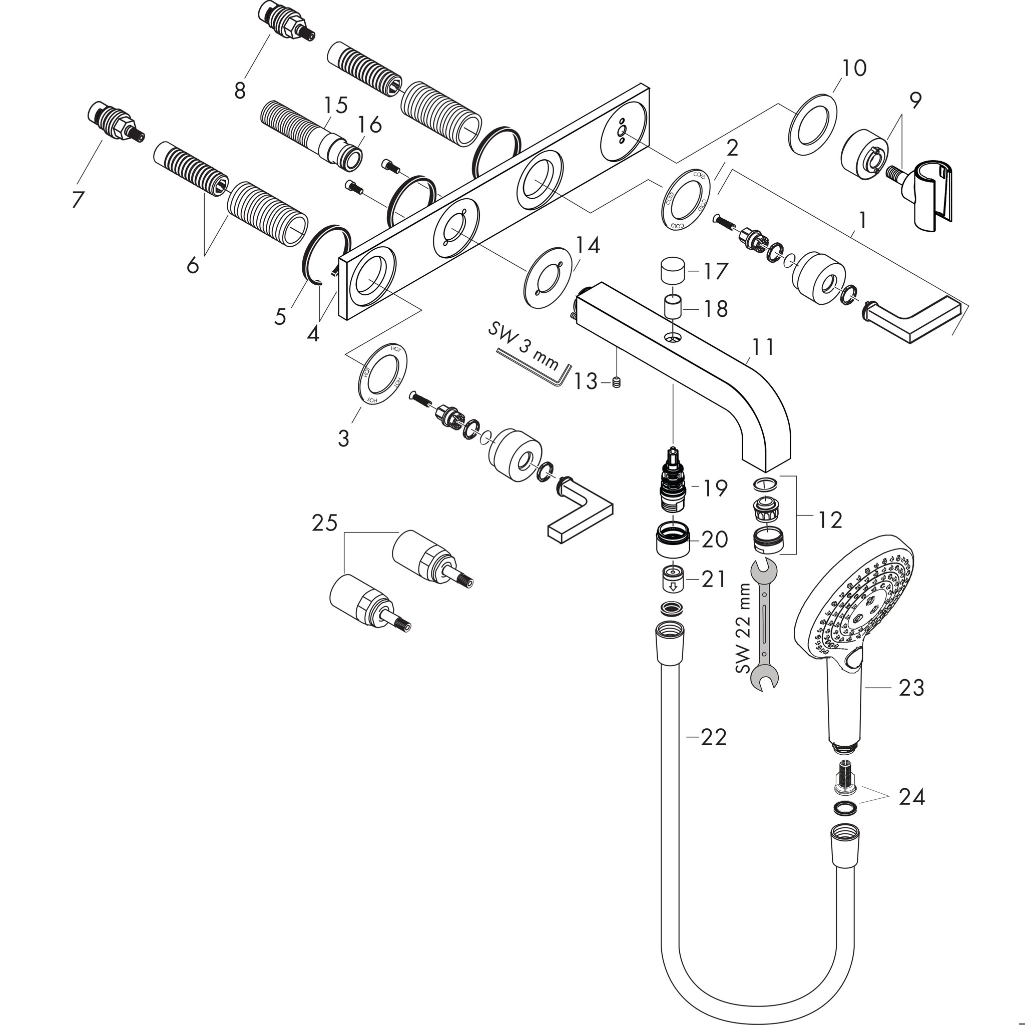 obsah balení: 3otvorová vanová baterie, ruční sprcha, držák sprchy, sprchová hadice vyložení: 222 mm druh proudu baterie: normální proud maximální průtok při 3 barech: 22,5 l/min průtok pro vanový výtok při 3 barech: 22,5 l/min průtok ruční sprchy při 3 barech: 20 l/min keramické ventily pro teplou a studenou vodu 90° přepínač s automatickým resetováním zpětný ventil rozměr přívodů: DN15 typ připojení: základní těleso upevnění na stěnu minimální provozní tlak: 1 bar maximální provozní tlak: 10 barů není nutný žádný další otvor pro údržbu druh proudu ruční sprchy: Rain, RainAir, WhirlAir