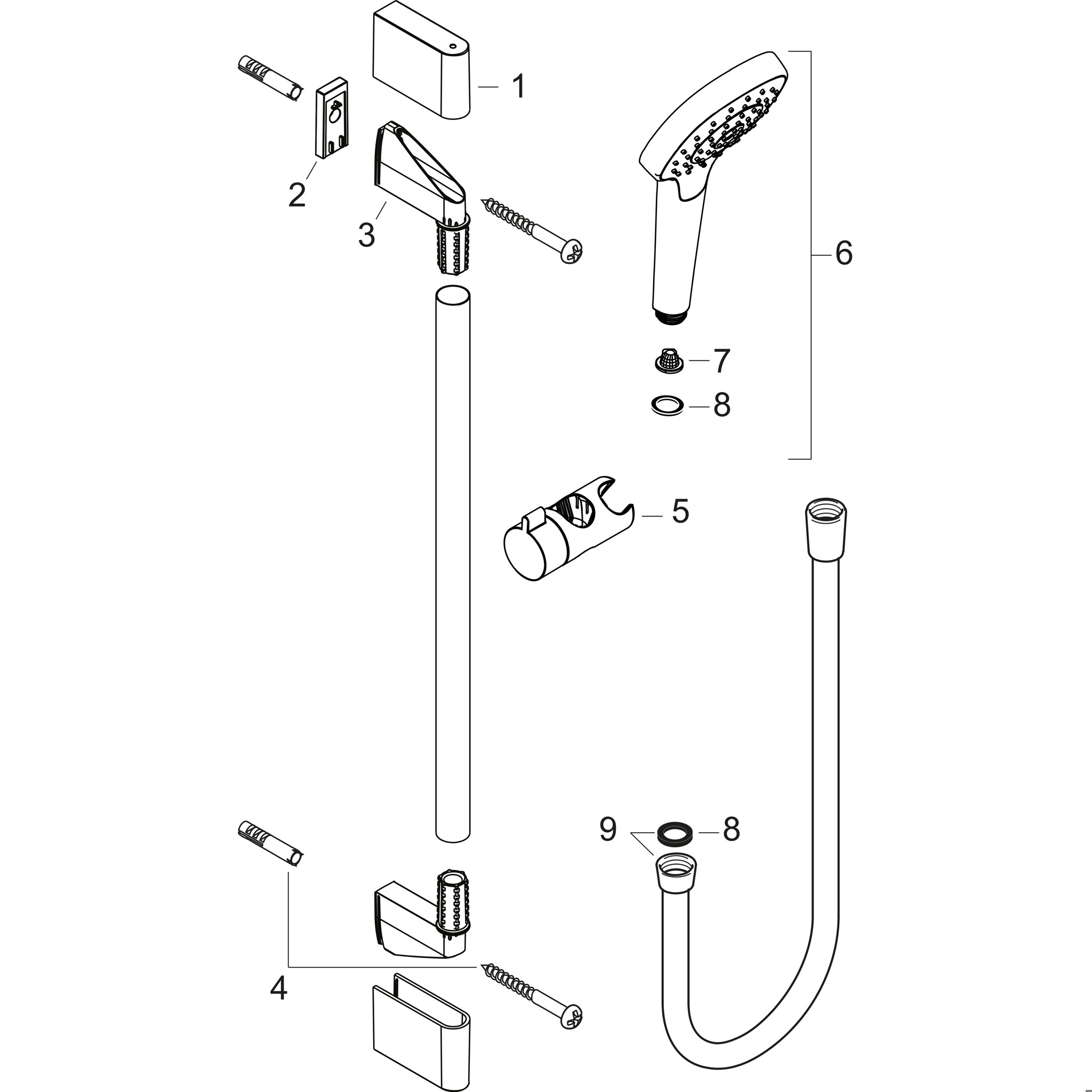 se skládá z: Ruční sprcha, sprchová tyč, sprchová hadice, držák ruční sprchy.