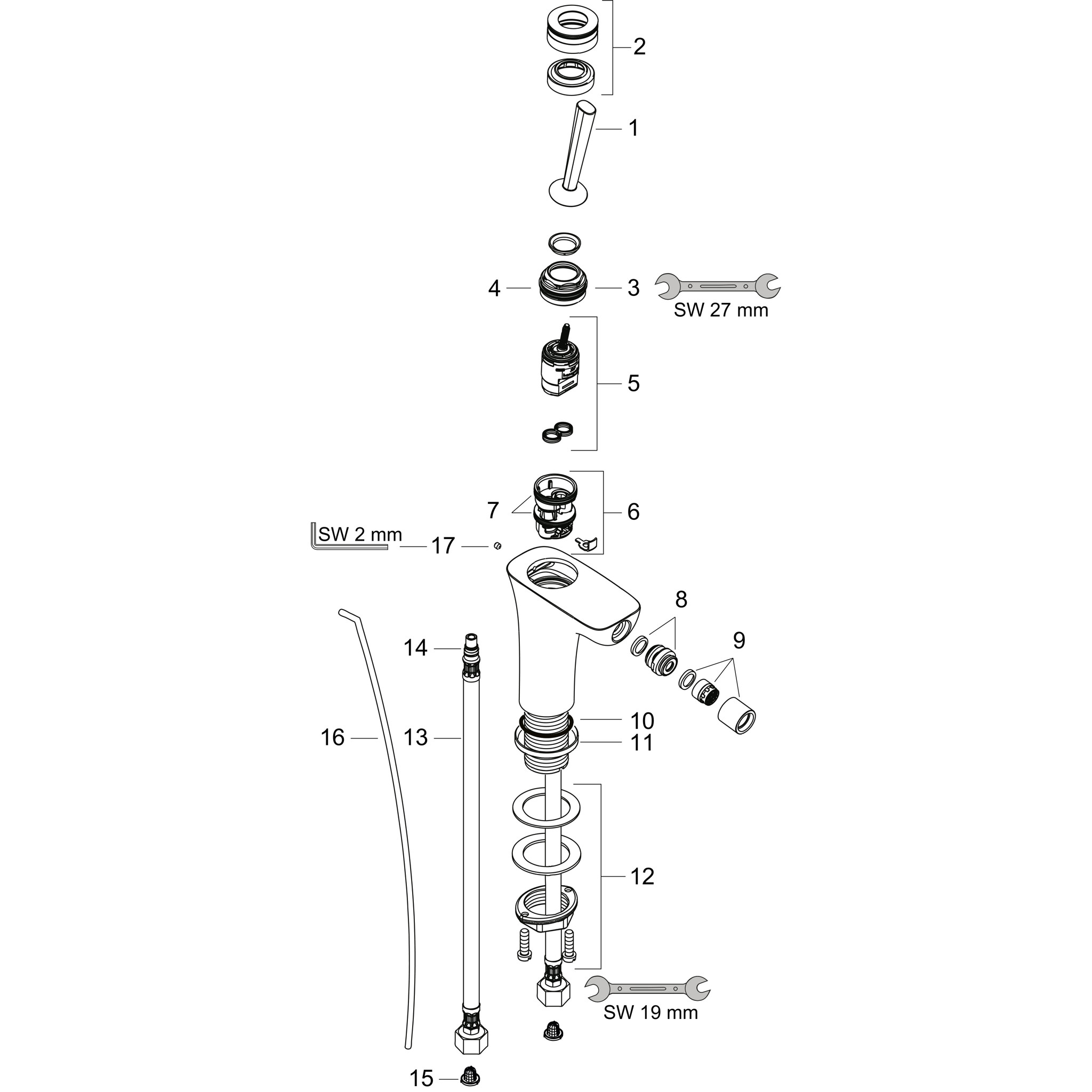 se skládá z: Jednopáková bidetová baterie, vyskakovací odpad Výstupek: 106 mm Výška výtoku: 101 mm tryska s kulovým kloubem Typ proudu: laminární proud Maximální průtok při 3 barech: 7,2 l/min Keramický směšovací systém Vhodný pro průtokové ohřívače vody Materiál vypouštěcí armatury: kov Typ připojení: připojovací hadice G ⅜