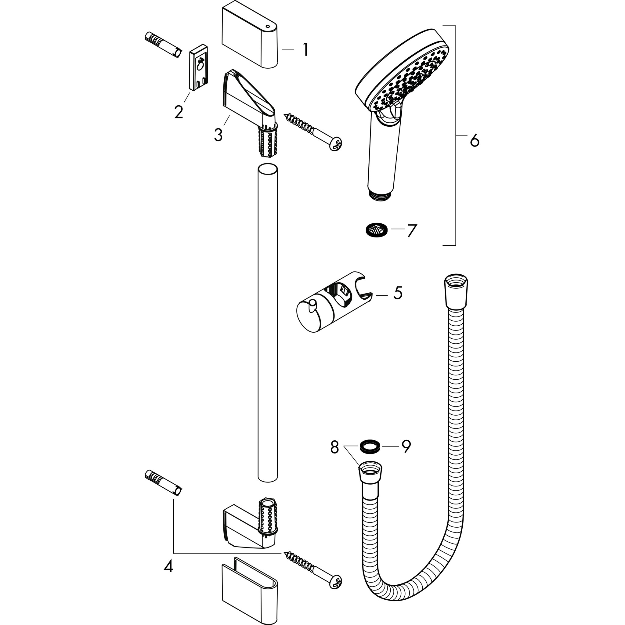 se skládá z: Ruční sprcha, sprchová tyč, sprchová hadice, držák ruční sprchy. Velikost sprchové hlavice: 100 mm Typ proudu: Rain, IntenseRain Přepínání typu proudu pomocí otočného disku QuickClean: usazeniny vodního kamene lze jednoduše setřít prstem 45° nastavitelný úhel sklonu držáku ruční sprchy Maximální průtok při 3 barech: 15,2 l/min Minimální průtokový tlak: 1 bar Plastové držáky na stěnu Profil sprchové lišty: kulatý Celková délka sprchové lišty: 669 mm Průměr sprchové lišty: 22 mm Vzdálenost vrtání: 625 mm Sprchová hadice s oboustrannou kónickou maticí