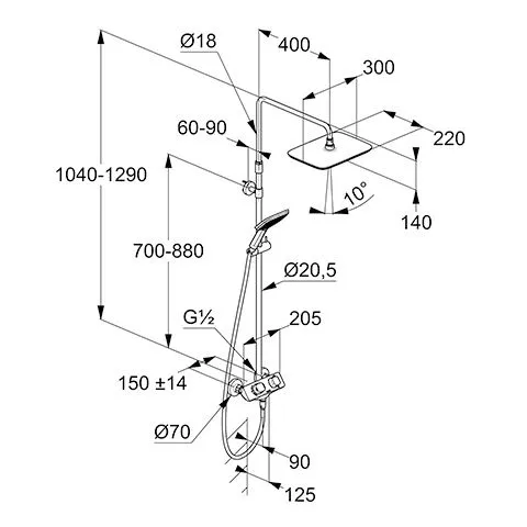 KLUDI-COCKPIT Explorer Termostatický duální sprchový systém DN 15 Montáž na stěnu s horizontálně a vertikálně nastavitelnou trubkou Horizontálně a vertikálně nastavitelný šoupátkový ventil Rukojeť pro volbu teploty se zámkem teplé vody 40 °C s keramickým uzavíracím ventilem jako otočný ventil 90°/90° Výstup sprchy ve spodní části G 1/2 Ruční sprcha otočný ventil vlevo Sprchový výstup nahoře Horní sprcha Otočný ventil vpravo Jiskrově bezpečný proti zpětnému toku Sítka pro zachycení nečistot KLUDI-SUPARAFLEX SILVER sprchová hadice 6107205-00 se sprchovou hlavicí KLUDI-FRESHLINE 6445005-00 Průtok sprchové hlavice 20 l/min při 3 barech s ruční sprchou KLUDI-FRESHLINE CL 1S 6450005-00 s montážním materiálem
